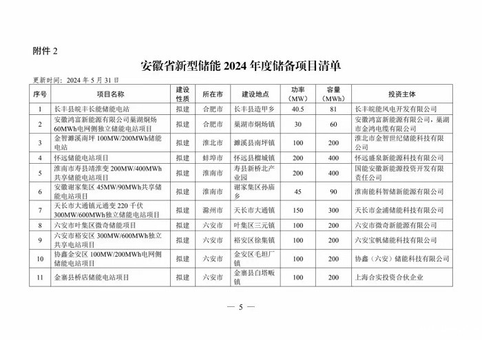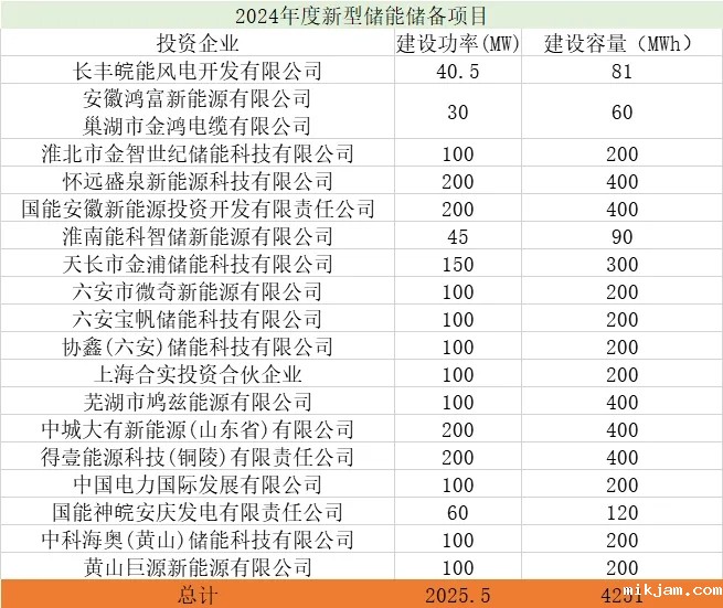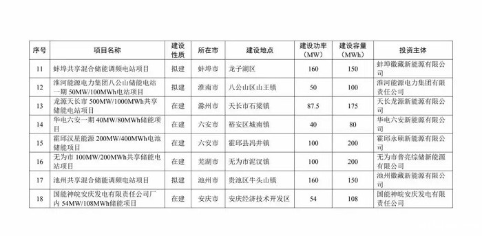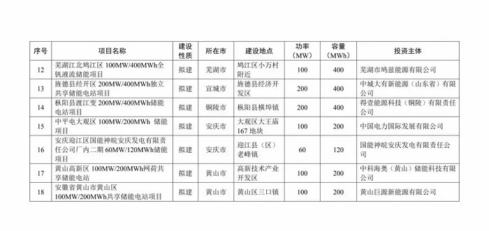 2、2024年度新型储能储备项目18个,总容量2025.5MW/4251MWh。涉及皖南风电、中诚大有、国能 、芜湖交投、协鑫、中国电力等企业。