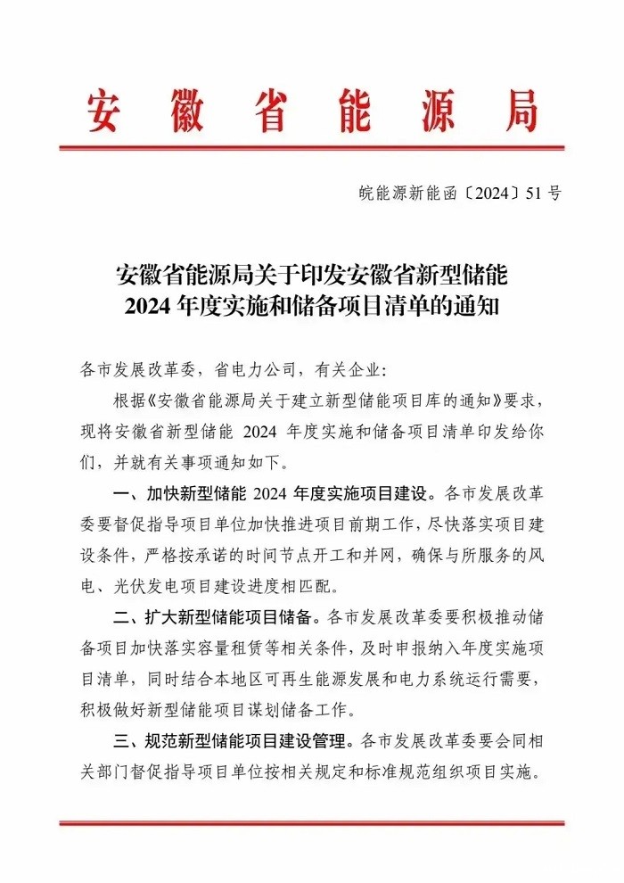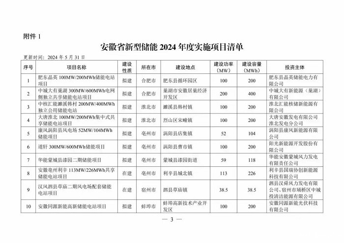 通知要求,2024年度实施项目需严格按承诺的时间节点开工和并网,确保与所服务的风电、光伏发电项目建设进度相匹配。电力调度机构应按照法律法规和技术规范要求,优化调度运行机制,科学优先调用,保障新型储能利用率,充分发挥新型储能作用。 根据安徽省2024年上半年电力数据简报,截至2024年6月底,全社会装机容量11520.5万千瓦、其中水电619.8万千瓦、火电6175.2万千瓦、风电767.2万千瓦、太阳能3727.6万千瓦、新型储能230.6万千瓦。 为发挥独立新型储能迎峰度夏电力保供顶峰作用,2024年7月,安徽省能源局发布了拟统筹调用以下独立新型储能及新能源配建的新型储能项目。涉及41个项目,装机容量2.057GW/3.23GWh.。 原文如下: